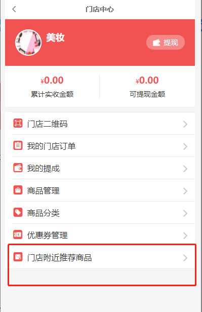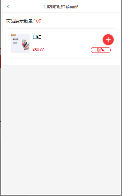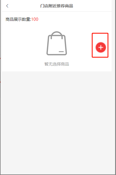 开启功能后,门店店长手机端门店中心显示门店附近推荐商品功能入口,店长可以手动选择在附近商品显示的商品。