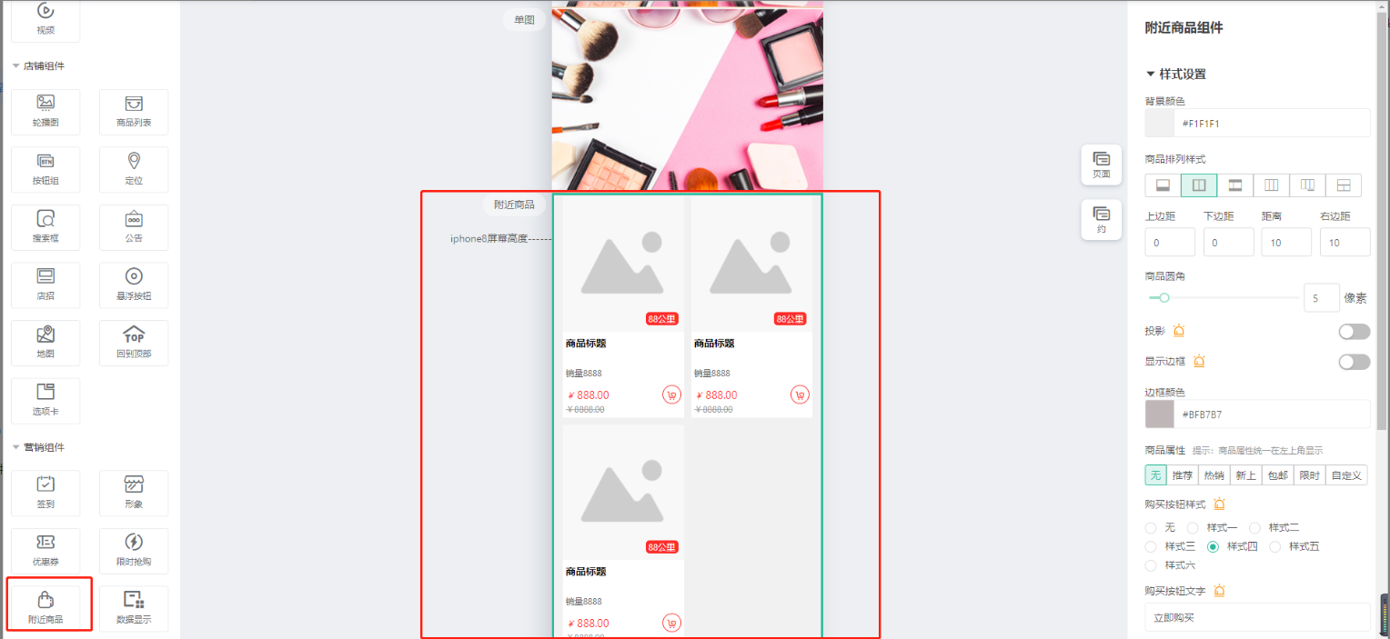 功能开启后店铺装修显示附近商品组件,添加到DIY页面上,设置组件相关参数,功能类似商品组件。